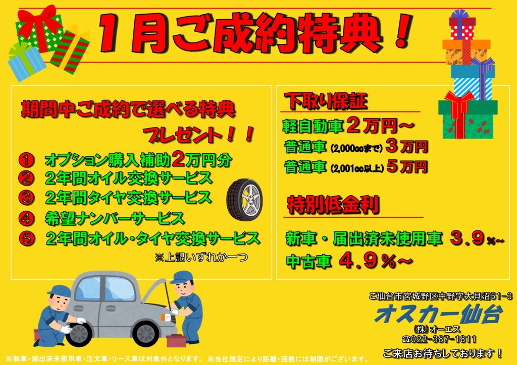 2026年01月14日 1月のご成約特典 ★期間中ご成約で選べる特典いずれかプレゼント‼ ★下取り価格保証 軽2万円~ 普通車3万円~(2,000㏄以下)、5万円~(2,001以上) ★特別低金利 新車・届出済未使用車3.9%~ 中古車4.9%~ ※新車・届出済未使用車・注文車・リース車は対象外となります。 ※当社規定により距離・回数には制限がございます。 ※特典は本体価格30万円以上が対象となります。